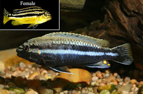 The Auratus Cichlid or Melanochromis auratus is a freshwater fish from Lake Malawi in Africa. Also known as the Malawi Golden Cichlid, this fish is born a bright yellow color with the juveniles having two black stripes on their sides, and one on their dorsal fin. As the fish begins to mature these lines will turn more blue. The males of this species will become black with golden stripes, almost the opposite of their female counterparts.